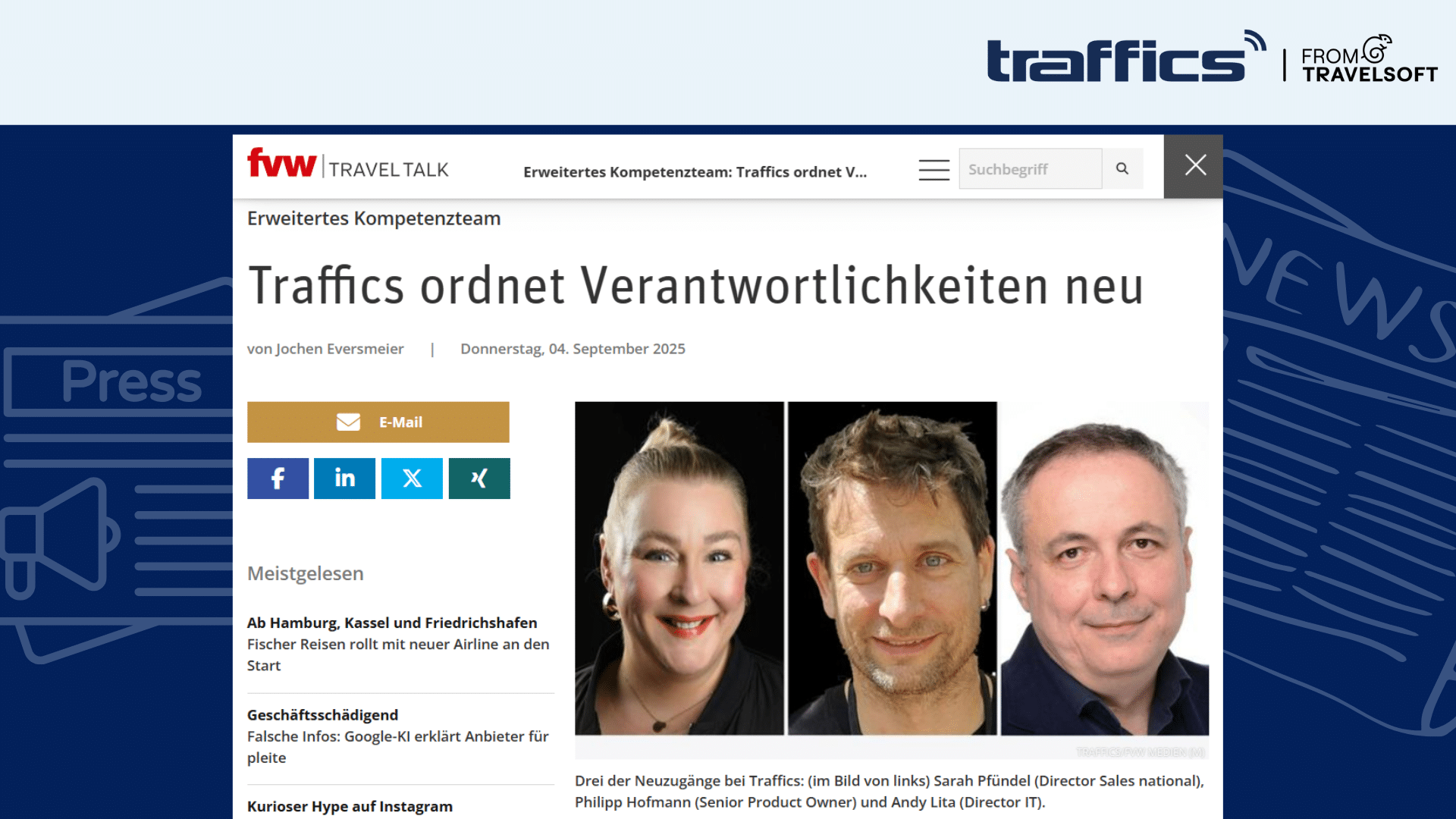 Berlin (w&p) 4. September 2025 – Die traffics Softwarelösungen für den Tourismus GmbH, einer der führenden Technologieanbieter für die Touristik, richtet sich mit einem erweiterten Kompetenzteam aus Experten für die zentralen Unternehmensbereiche neu aus. Mit klaren Verantwortlichkeiten möchten die Berliner ein Zeichen für weiteres Wachstum und Innovationskraft im Markt setzen.